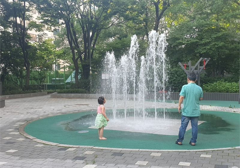 연일 지속되는 폭염 속에 한 아파트 분수대에 아이가 신나게 물놀이를 하고 있다. 정기홍 기자