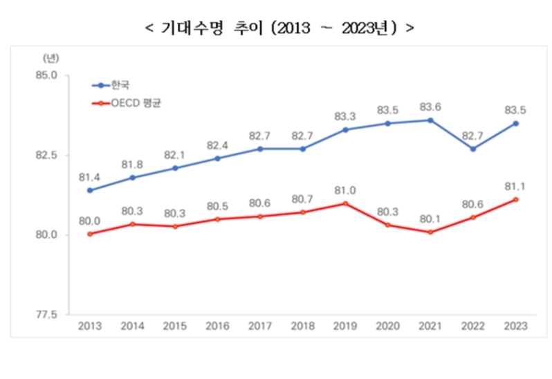 건강 관련 지표를 살펴보면, 우리나라 국민 기대수명은 83.5년으로 OECD 국가 평균(81.1년)보다 2.4년 길었으며, 기대수명이 가장 긴 스위스(84.3년)보다는 0.8년 적었다. 우리나라는 OECD 국가 중 5위였다.