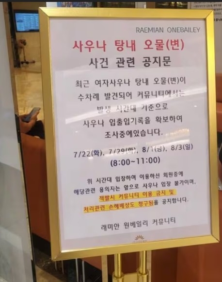 원베일리 커뮤니티는 공지문을 통해 “오물 사건 발생 시간대 기준으로 사우나 입출입 기록을 확보해 조사 중이다”며 “용의자는 앞으로 사우나 입장 불가이며 적발 시 커뮤니티 이용 금지 및 처리 관련 손해배상도 청구될 것”이라고 했다.