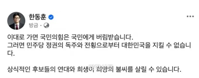 한 전 대표는 16일 자신의 SNS에 글을 올려 :상식적인 후보들의 연대와 희생이 희망의 불씨를 살릴 수 있다"며 "이대로 가면 국민의힘은 국민에게 버림받고 민주당 정권의 독주와 전횡으로부터 대한민국을 지킬 수 없다"고 밝혔다.