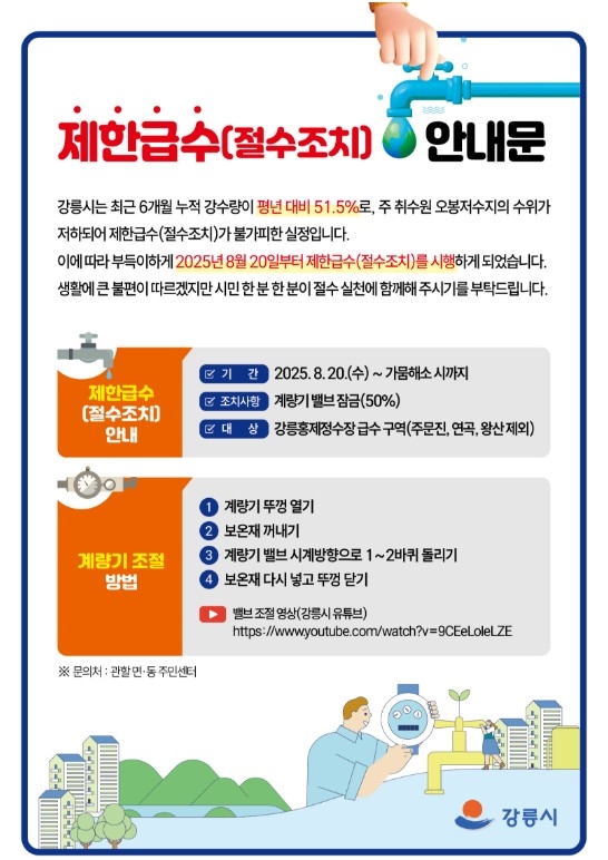 강원 강릉시의 제한급수 안내문. 행정안전부는 지난 30일 오후 7시부로 극심한 가뭄을 겪고 있는 강릉시 일원에 재난사태를 선포했다. 강릉은 사회재난이 아닌 자연재난으로는 사상 첫 재난 사태 지역이 됐다. 강릉시