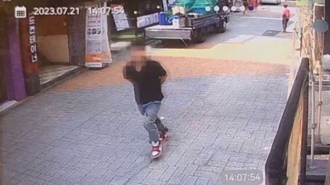 지난 2023년 7월 21일 오후 서울 지하철 2호선 신림역 부근에서 시민들에게 무차별 칼부림을 한 30대 남성 조 모 씨가 칼을 손 뒤로 들고 어디론가 뛰어가고 있다. 이 사건과 관련 없음. CCTV