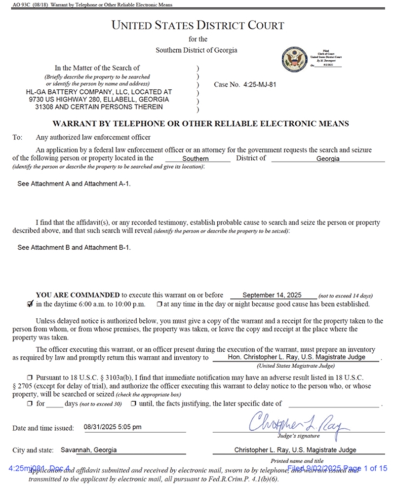 미국 국토안보수사국이 조지아주의 현대차그룹-LG에너지솔루션의 합작 배터리 공장을 수색하기 위해 발부받은 영장 내용