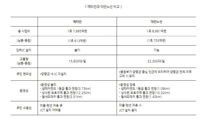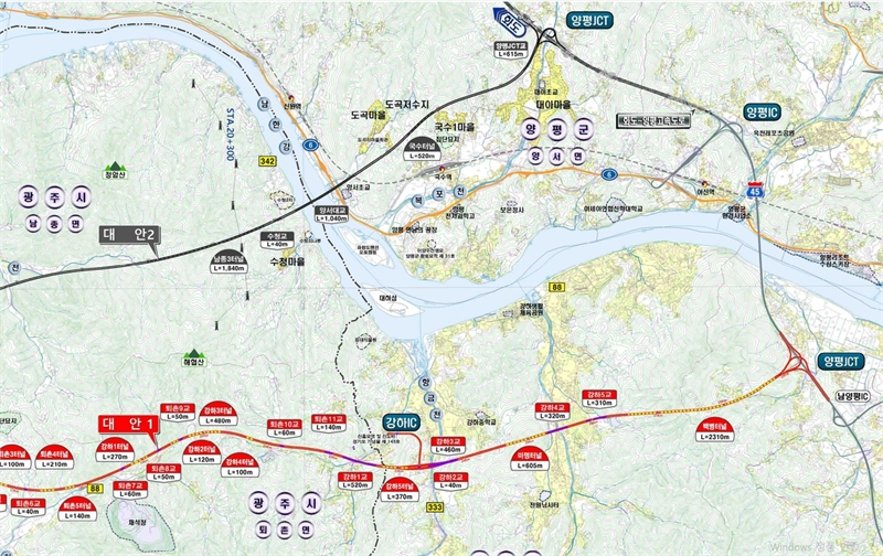 국토교통부가 지난 2023년 5월 8일 공개한 서울~양평 고속도로 2개 안. 1안(아래 노선)은 하남시 감일동에서 양평군 강상면(감일JCT~산사창IC~성산곡IC~남종IC~강하IC~양평JCT)까지 총 29.0㎞로 양평JCT 근처에 김건희 씨 일가 소유의 산이 있다. 2안은 하남시 감일동에서 양평군 양서면(감일JCT~산사창IC~성산곡IC~남종IC~양평JCT)까지 총 27.0㎞이다. 국토부