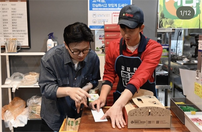 한 전 대표는 글과 함께 가게 관계자와 치킨 상자를 만들거나 영수증을 확인하며 대화하는 사진을 공개했다.