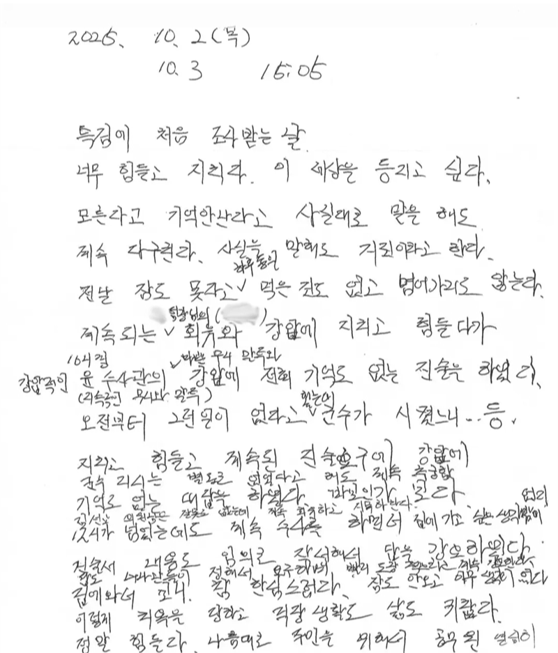 하지만 정 씨는 특검의 주장과 달리 조사 다음 날인 3일 자로 자필로 작성한 메모에서 “모른다고, 기억이 안 난다고 솔직히 말해도 계속 다그친다”, “지속되는 회유와 강압에 지치고 힘들다” 등 특검 수사에 대한 커다란 부담을 호소했다.