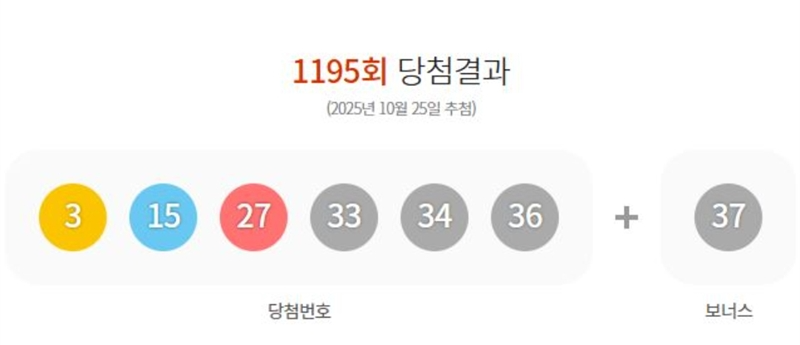 로또복권 운영사인 동행복권은 제1195회 로또복권 추첨에서 '3, 15, 27, 33, 34, 36'이 1등 당첨번호로 뽑혔다고 25일 밝혔다.