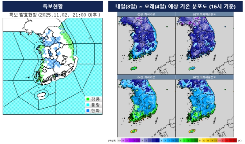 2일 오후 9시 이후 한파주의보 등 특보 현황(왼쪽)과 3~4일 예상 기온 분포도(2일 오후 4시 기준). 이상 기상청
