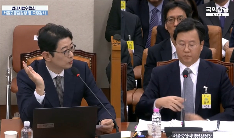 정진우 서울중앙지검장(오른쪽)이 10월 23일 서울 여의도 국회 법제사법위원회에서 열린 서울중앙지검 등에 대한 국정감사에 출석해 주진우 의원 질의를 듣고 있다. 국회방송