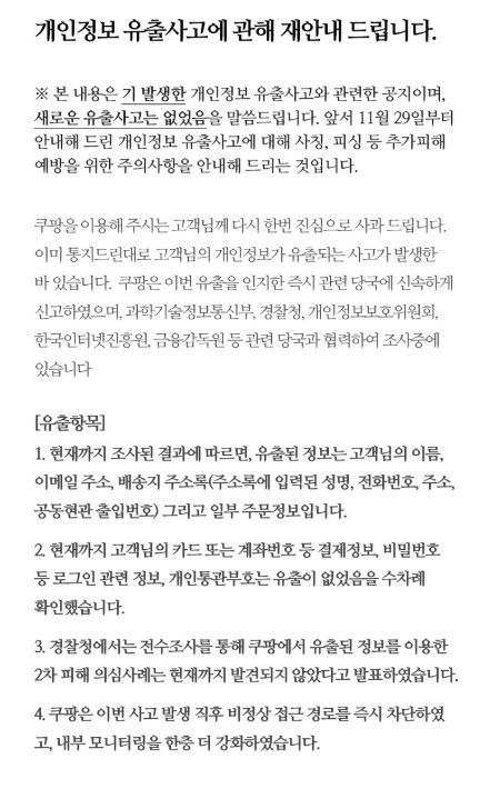쿠팡은 이날 공지문을 통해 "11월 29일부터 안내한 개인정보 '유출' 사고와 관련해 사칭·피싱 등 2차 피해 예방을 위한 주의사항을 다시 안내한다"며 이같이 밝혔다.